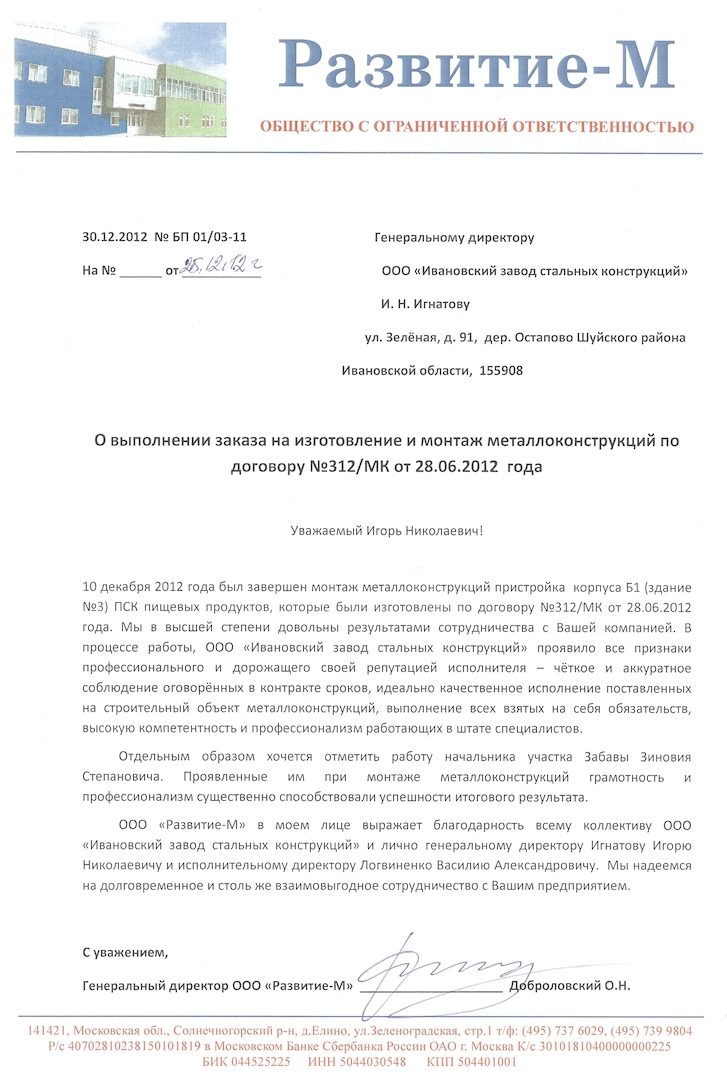 ООО «Развитие-М» в моем лице выражает благодарность всему коллективу ООО «Ивановский завод стальных конструкций» и лично генеральному директору Игнатову Игорю Николаевичу и исполнительному директору Логвиненко Василию Александровичу. Мы надеемся на долговременное и столь же взаимовыгодное сотрудничество с Вашим предприятием.