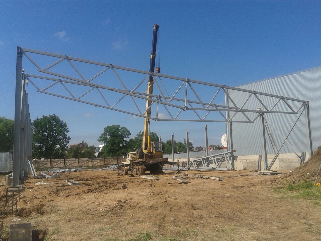 Начат монтаж металлоконструкций складского здания размерами 24х84 по адресу: Московская обл., Сергиево-Посадский муниципальный район, гор.Хотьково. Общий вес конструкций 104,7 тонны.