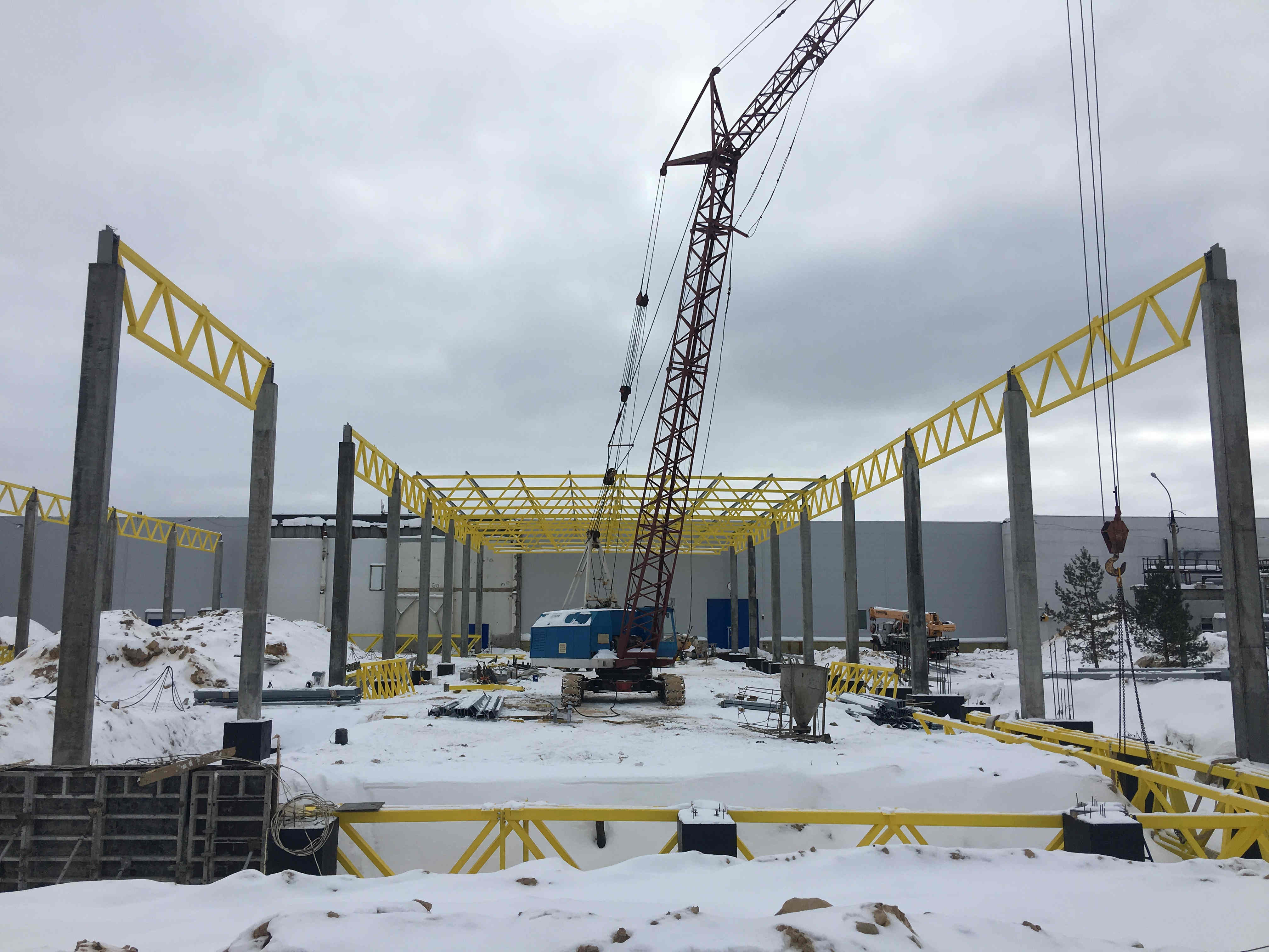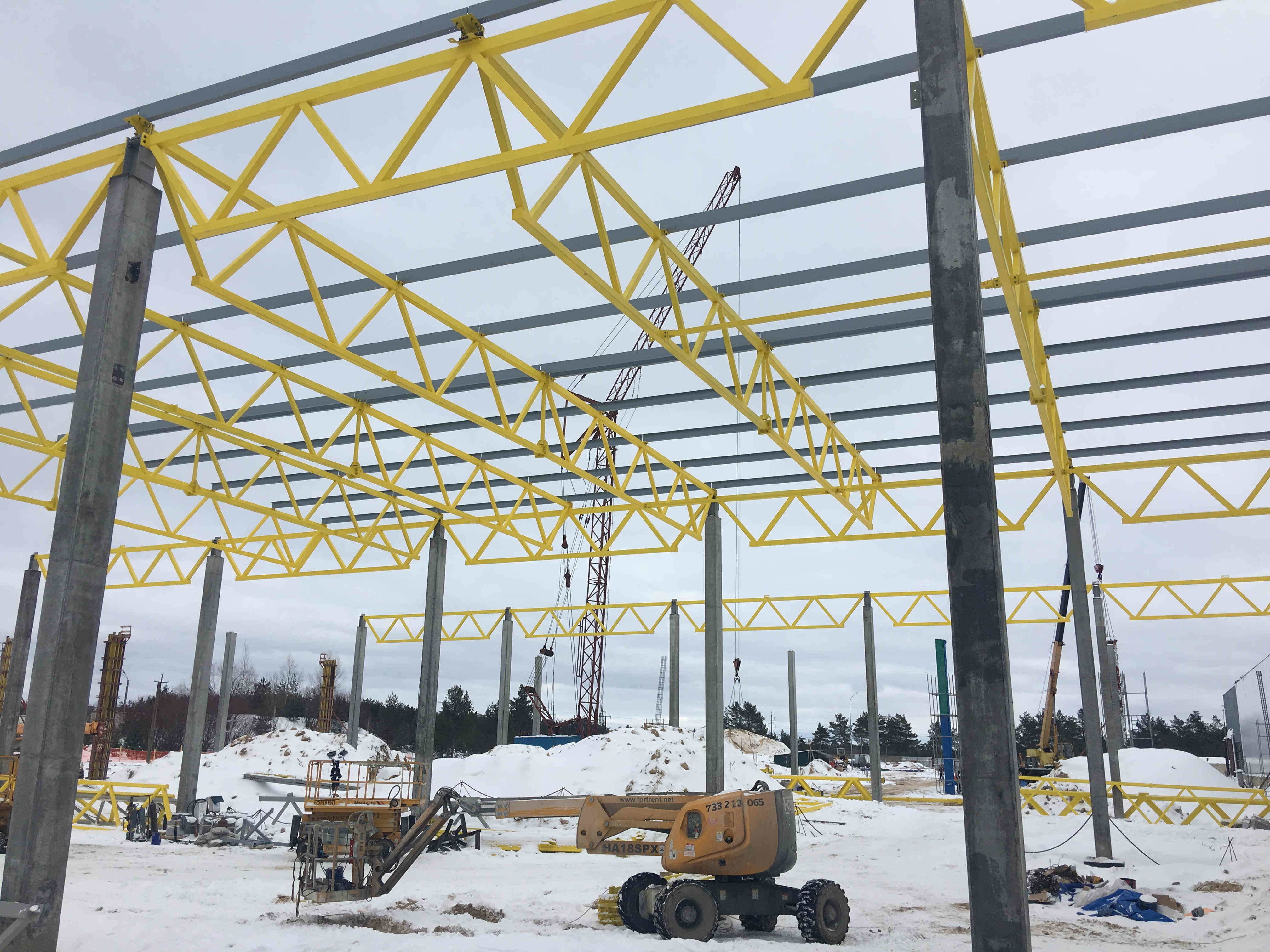 Ведутся работы по монтажу металлоконструкций завода по производству ламинированных напольных покрытий ООО «Юнилин» по адресу Нижегородская область, г.Дзержинск, ул.Лермонтова, 22. Вес изготовленных конструкций составляет 519 тонн.