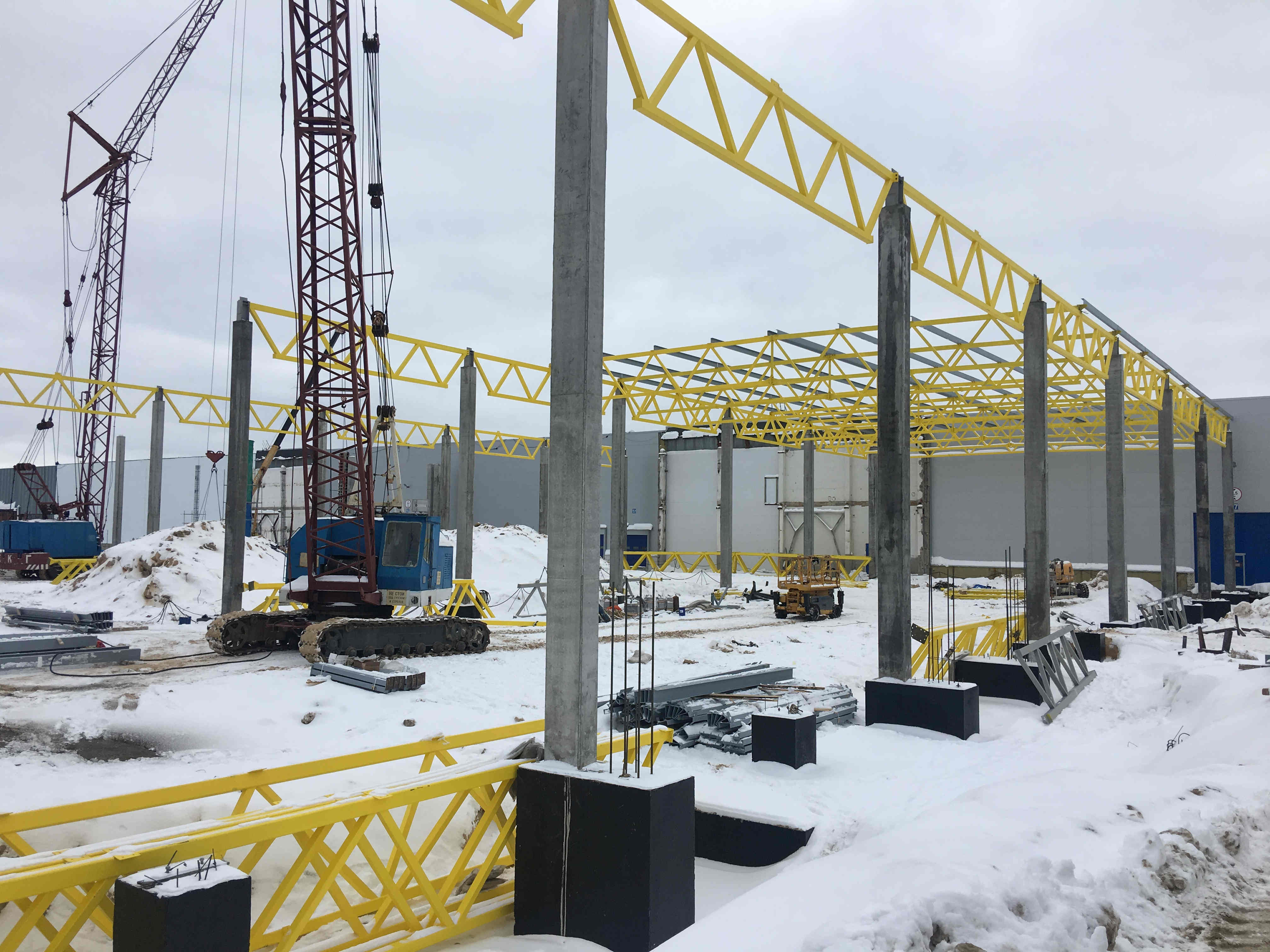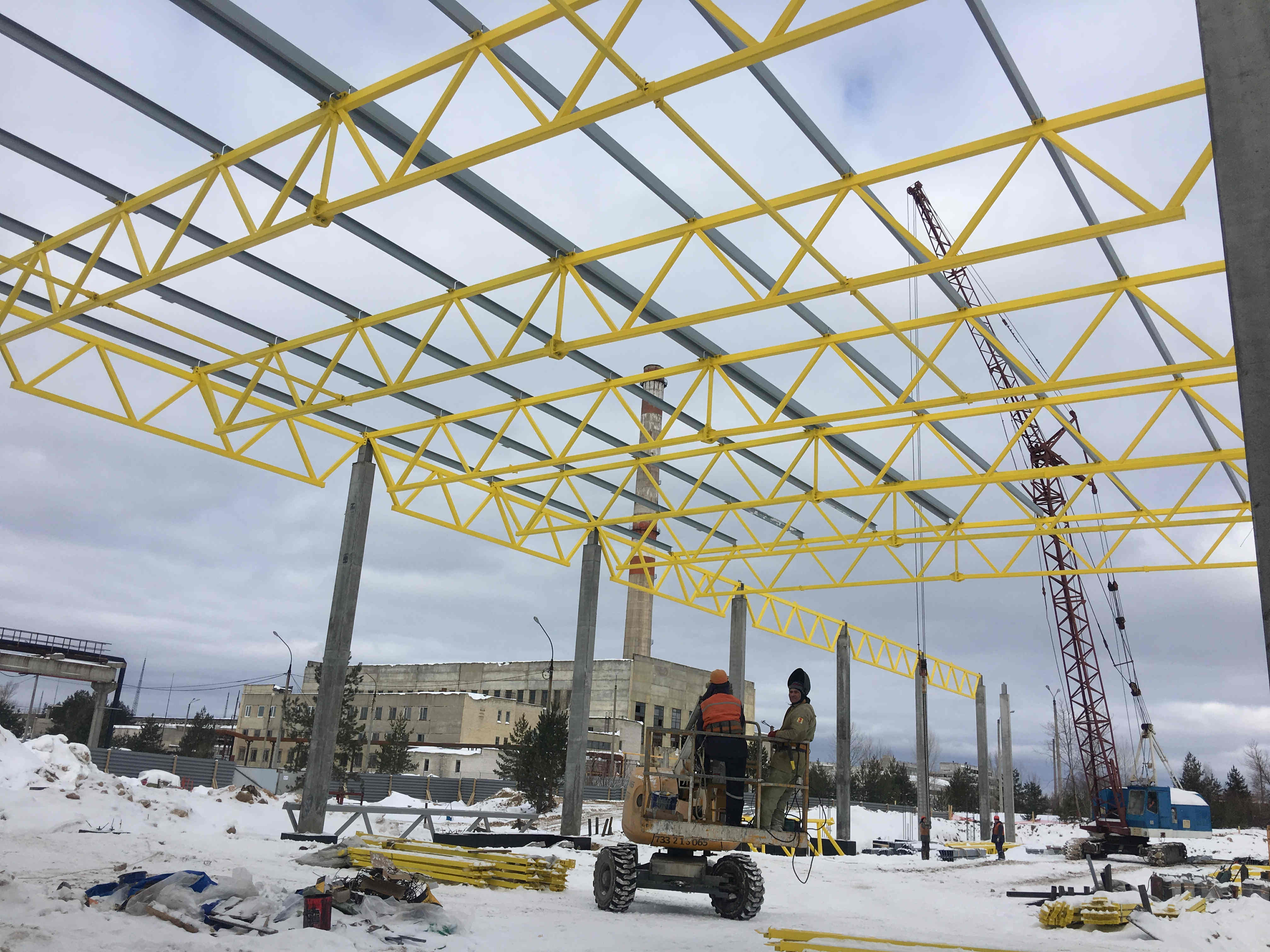 Ведутся работы по монтажу металлоконструкций завода по производству ламинированных напольных покрытий ООО «Юнилин» по адресу Нижегородская область, г.Дзержинск, ул.Лермонтова, 22. Вес изготовленных конструкций составляет 519 тонн.